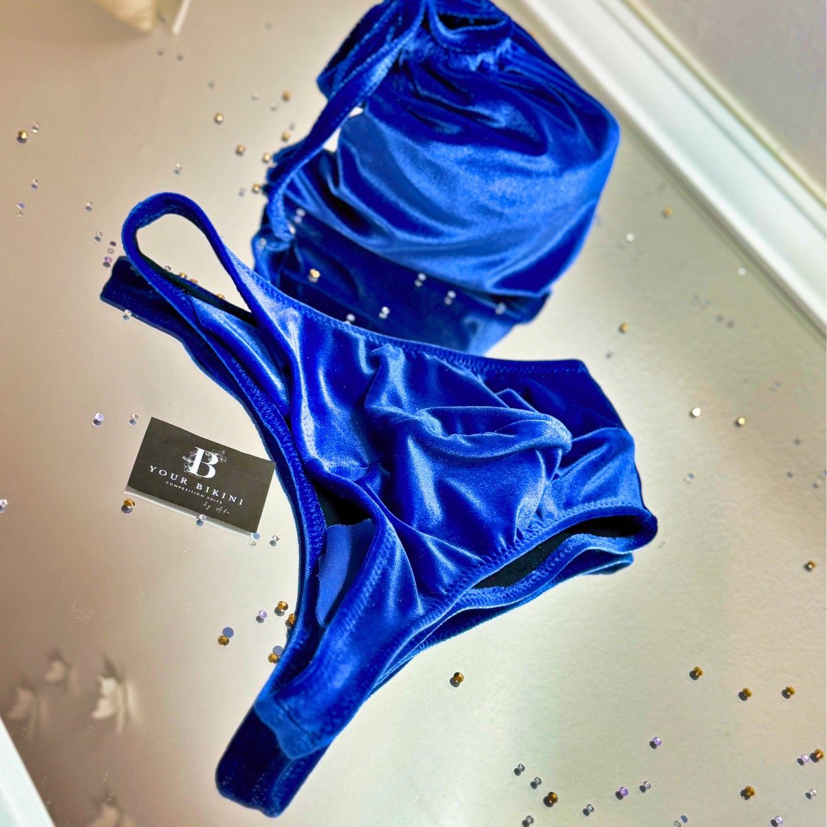 Bold blue posing suit with velvet fabric and a comfortable bodybuilding fit.