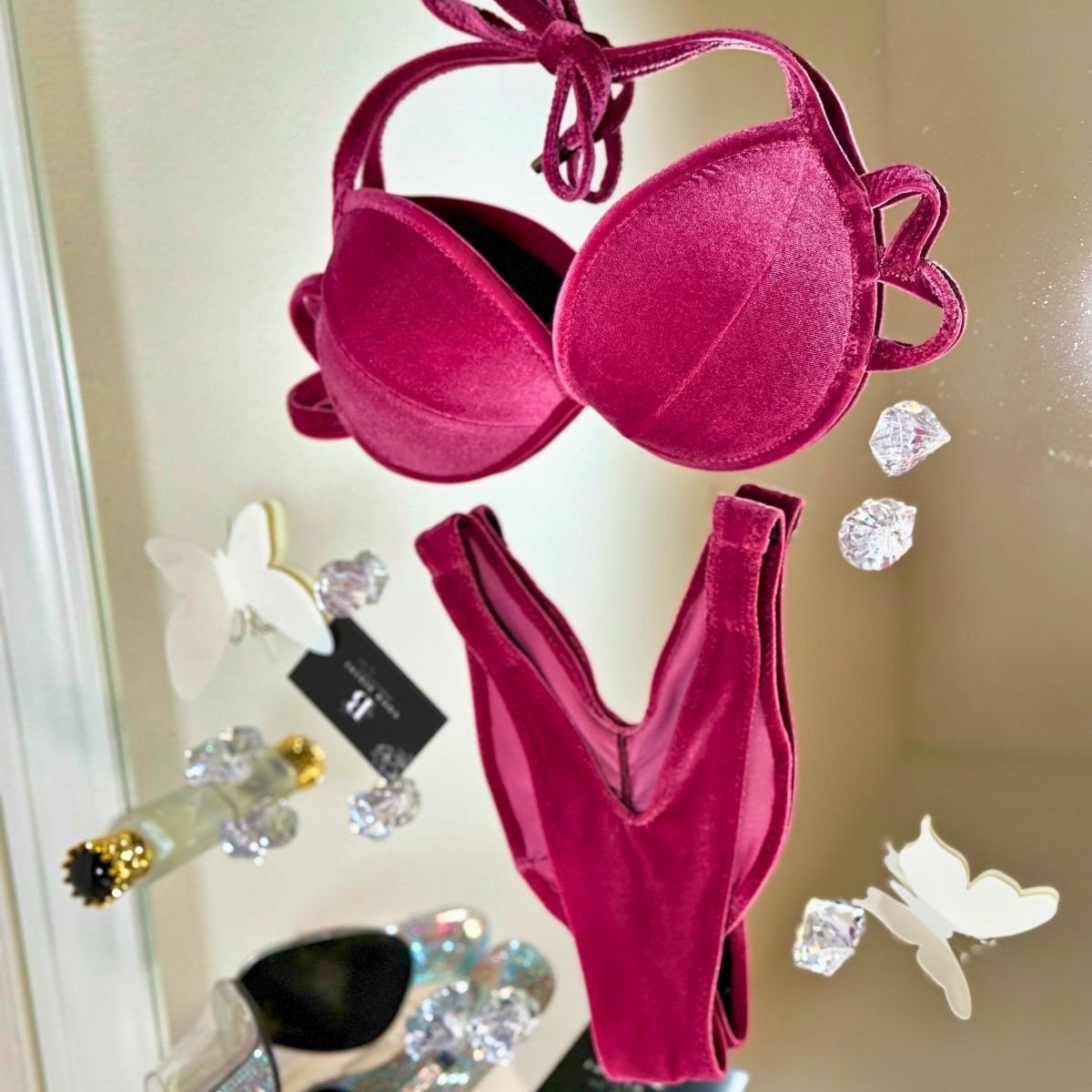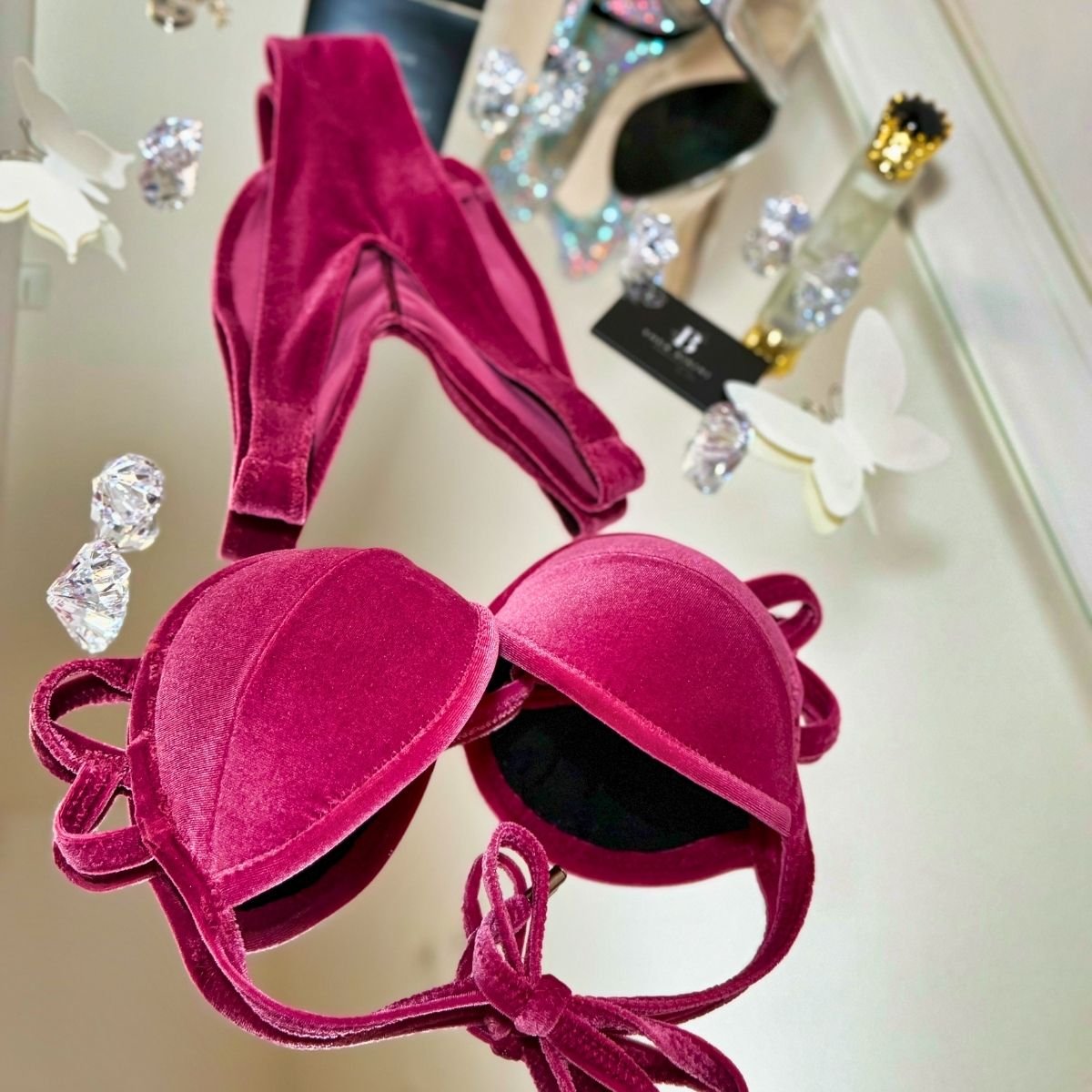 Soft pink posing bikini with velvet base and supportive underwire push-up fit.